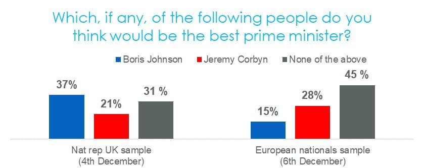 Neither main party leader has impressed EU nationals but EU nationals are slightly more partial to Jeremy Corbyn and Labour than Boris Johnson and the Conservatives. 28% of EU nationals think that Corbyn would be the best prime minister in a two-way question against Boris Johnson while 15% choose the prime minister. Almost half (45%) of EU nationals think that neither Corbyn nor Johnson would make the best prime minister.
