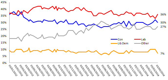 Labour have regained their lead after the Conservatives’s post-budget bounce reduced it to just 1%. Ed Miliband’s party has 36% of the vote vs. 30% for the Conservatives.