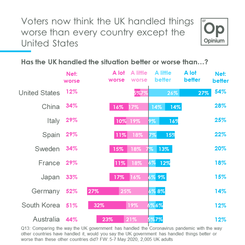 In the week that saw the UK become the country with the highest Coronavirus death toll in Europe, our latest poll shows the public now believe the UK Government has handled the crisis worse than every country asked about, apart from the United States.