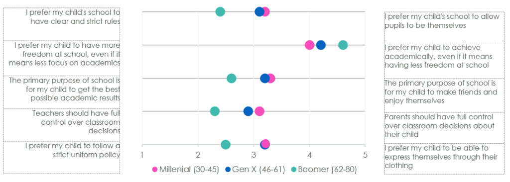 Similarly, Baby Boomers showed support for schools with clear and strict rules, including a strict uniform policy, and preferred their child to achieve academically even if it means having less freedom in school. Meanwhile, millennial parents showed a slight preference for their child’s school to allow pupils to be themselves, over a school with clear and strict rules.