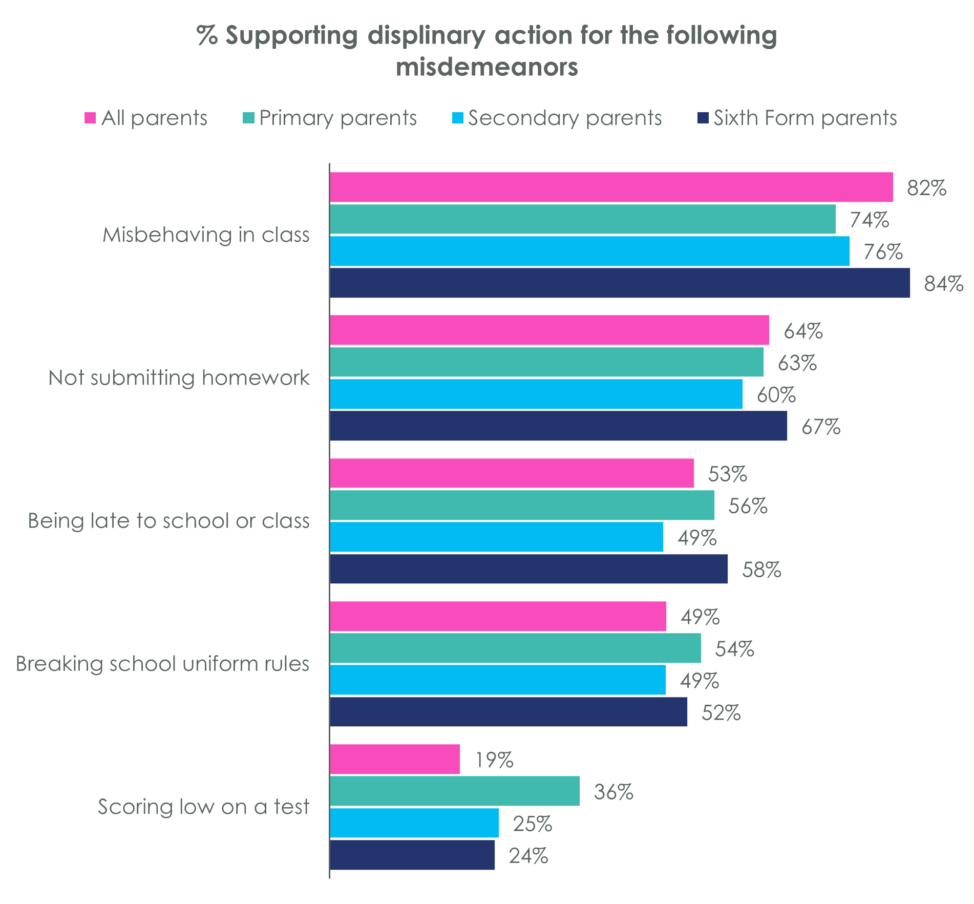 In terms of attitudes towards particular misdemeanours, parents showed the strongest support for pupils receiving sanctions for misbehaviour in class (82%), not submitting homework (64%), as well as being late to school or class (53%).