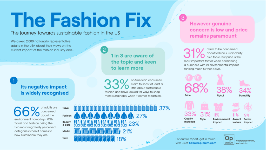 To explore the attitudes of American consumers towards the fashion industry and sustainability, Opinium surveyed a nationally representative sample of 2015 US adults. Here’s what we found: