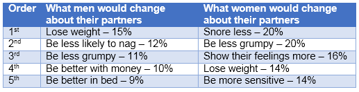 Top of the men’s wish list was that they would like their partner to lose weight (15%) and be less likely to nag (12%), while women said they would like their partner to snore less (20%) and be less grumpy (20%).