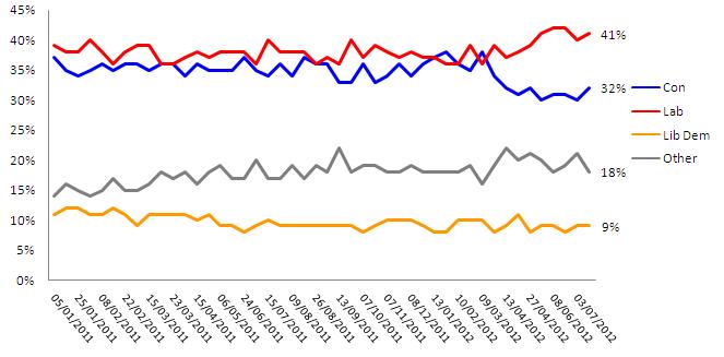 Labour have a slightly smaller lead than in previous surveys but on 41% are still 9 points ahead of the Conservatives on 32%. The Liberal Democrats remain on 9% while UKIP are on 8%.