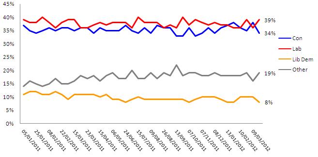 - After showing a Tory lead in our March 9th poll, the blue and red lines have moved in exactly opposite directions with Labour moving up to 39% while the Tories drop to 34%