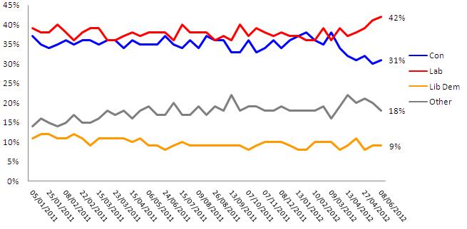 Labour have held on to their 11 point lead with 42% of the vote compared to 31% for the Conservatives, 9% for the Liberal Democrats and 8% for UKIP.