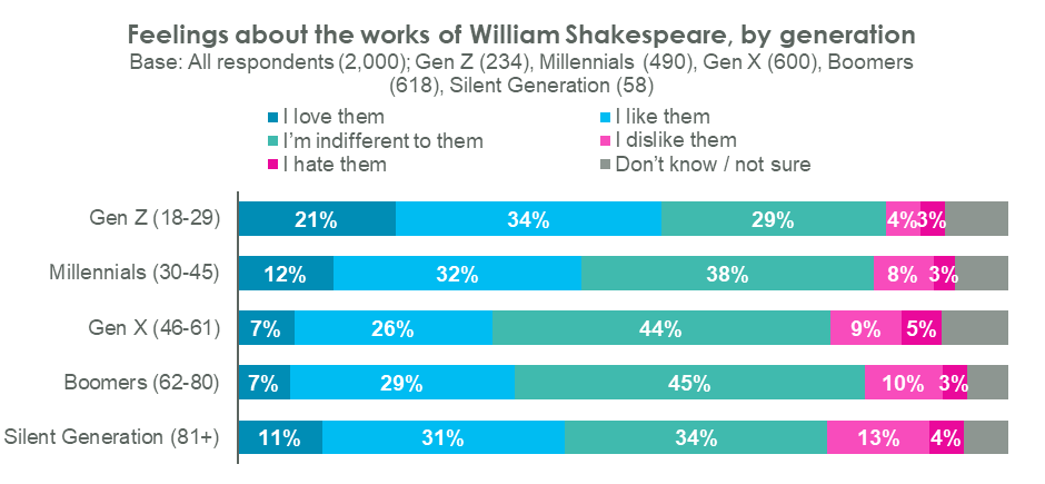 Perhaps more surprisingly however, is the generational differences, counteracting commonly held assumptions. Gen Z’s (18-29 year olds) are the most likely to report love for Shakespeare’s plays (21%), compared to just 12% of Millennials, and dropping to 7% among Gen X and Boomers.