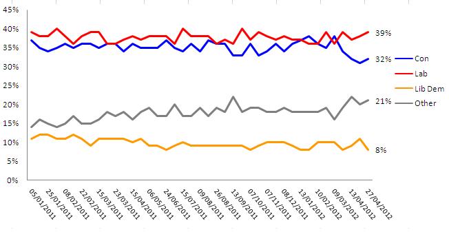 With voters punishing both coalition parties in the local elections and the UK officially having entered a double dip recession, likely voters still don’t really trust Labour on the economy: